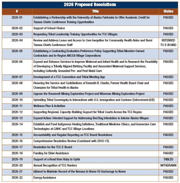 Each year, resolutions are submitted for review by the Tanana Chiefs Conference (TCC) Full Board of Directors. These resolutions guide the direction of TCC and its employees throughout the coming year and beyond. At the 2026 TCC Annual Convention & Full Board of Directors Meeting, 22 resolutions were submitted, with 18 resolutions passing after thorough discussion and debate.