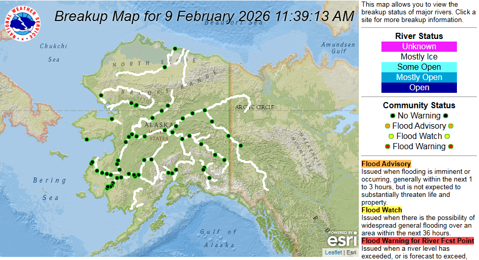 The static image map below provides a breakup status on the rivers. This is a helpful tool to understand what the flood risk is in your community on a day-to-day basis. For more information and to use the interactive version of the map, Visit the National Weather Service Breakup Page.