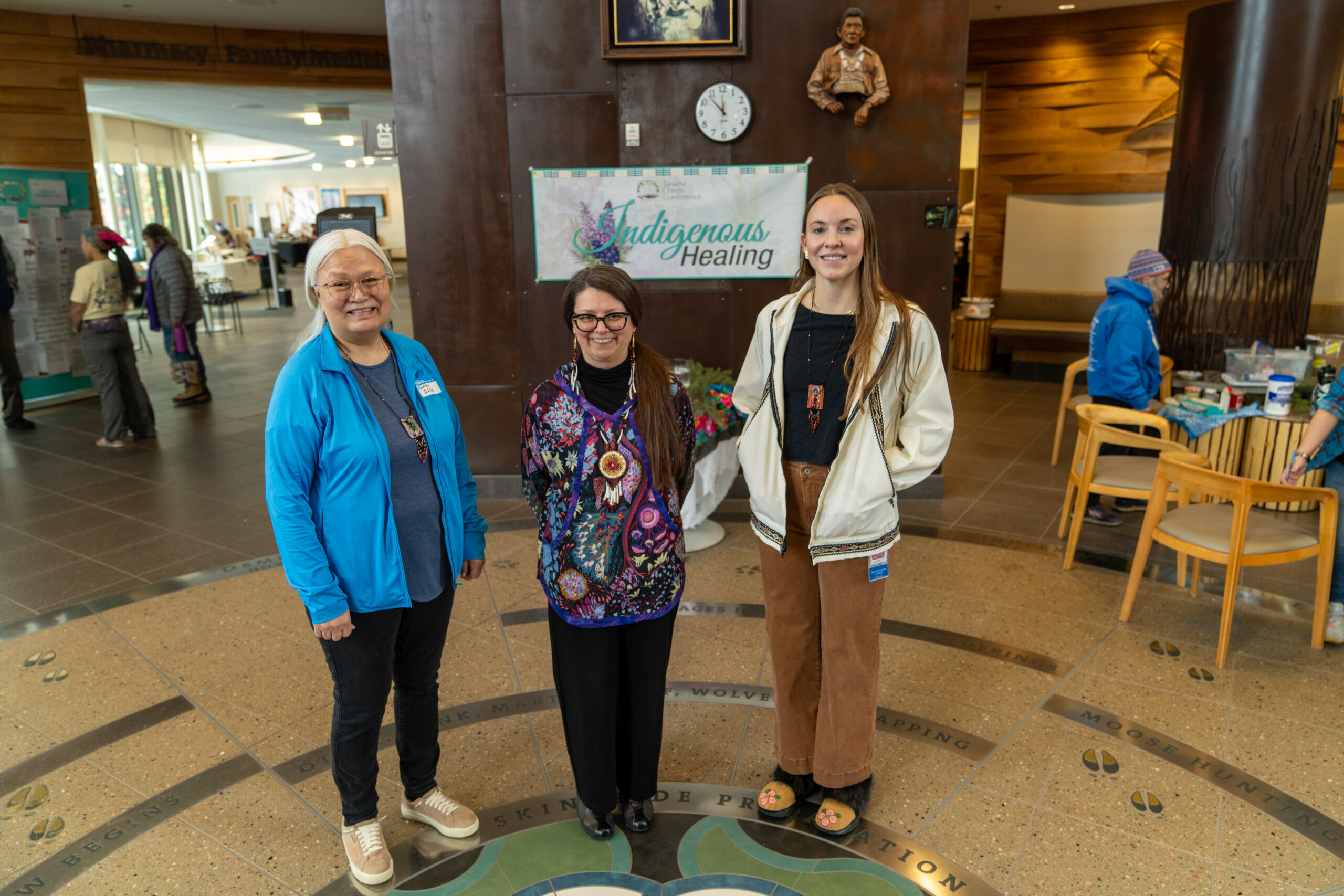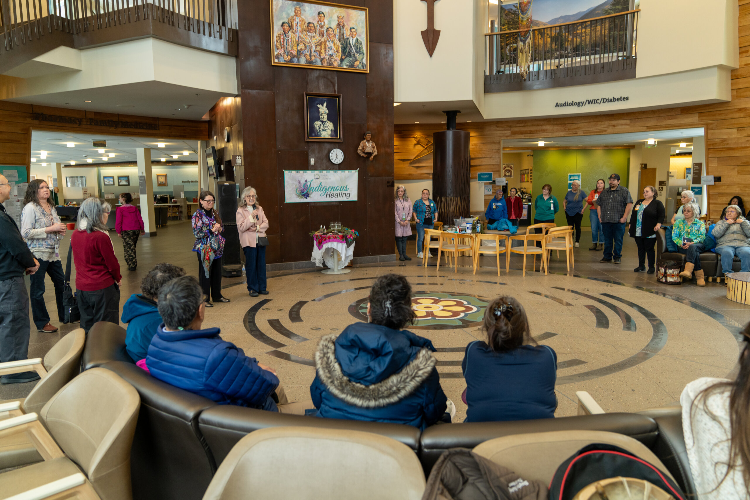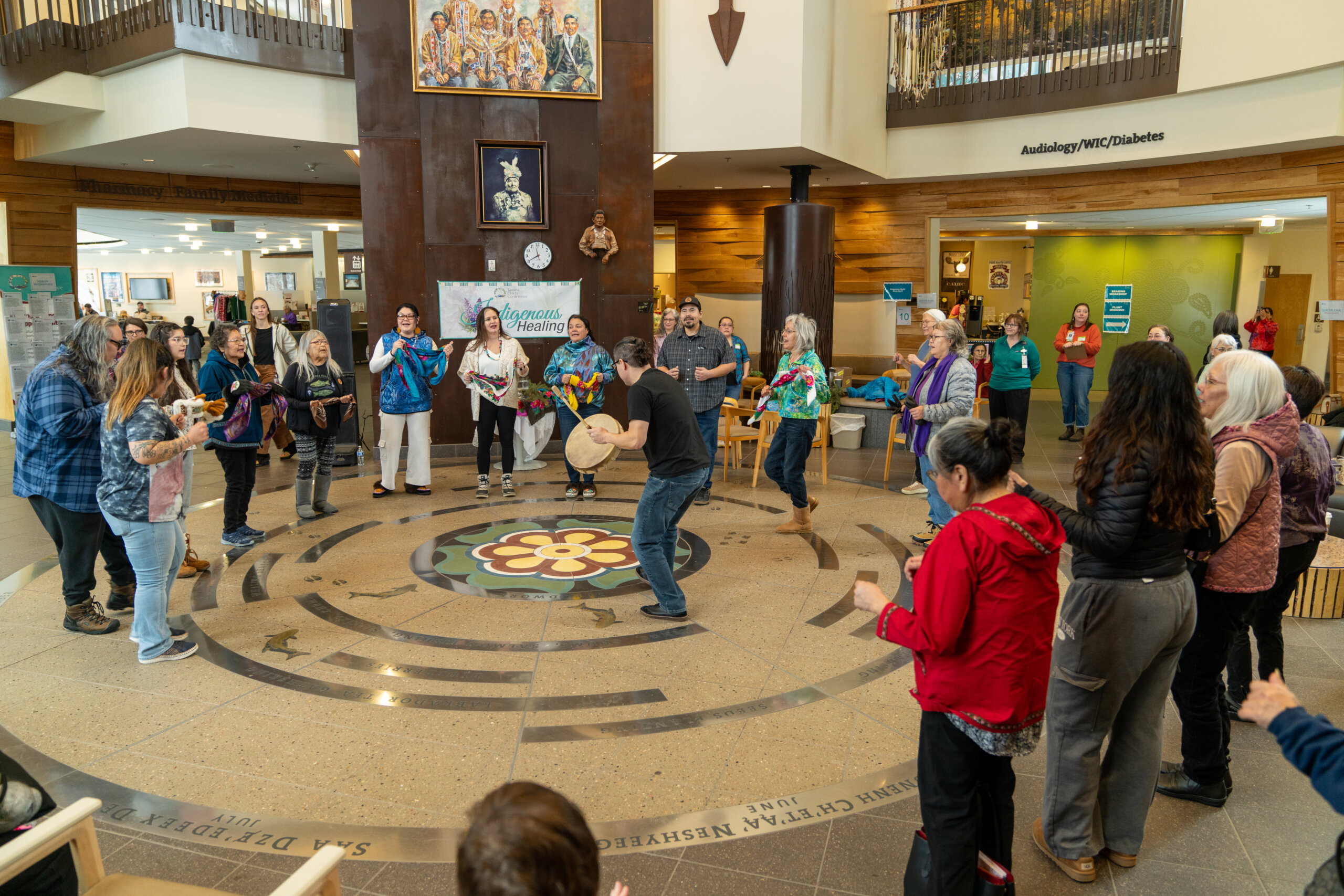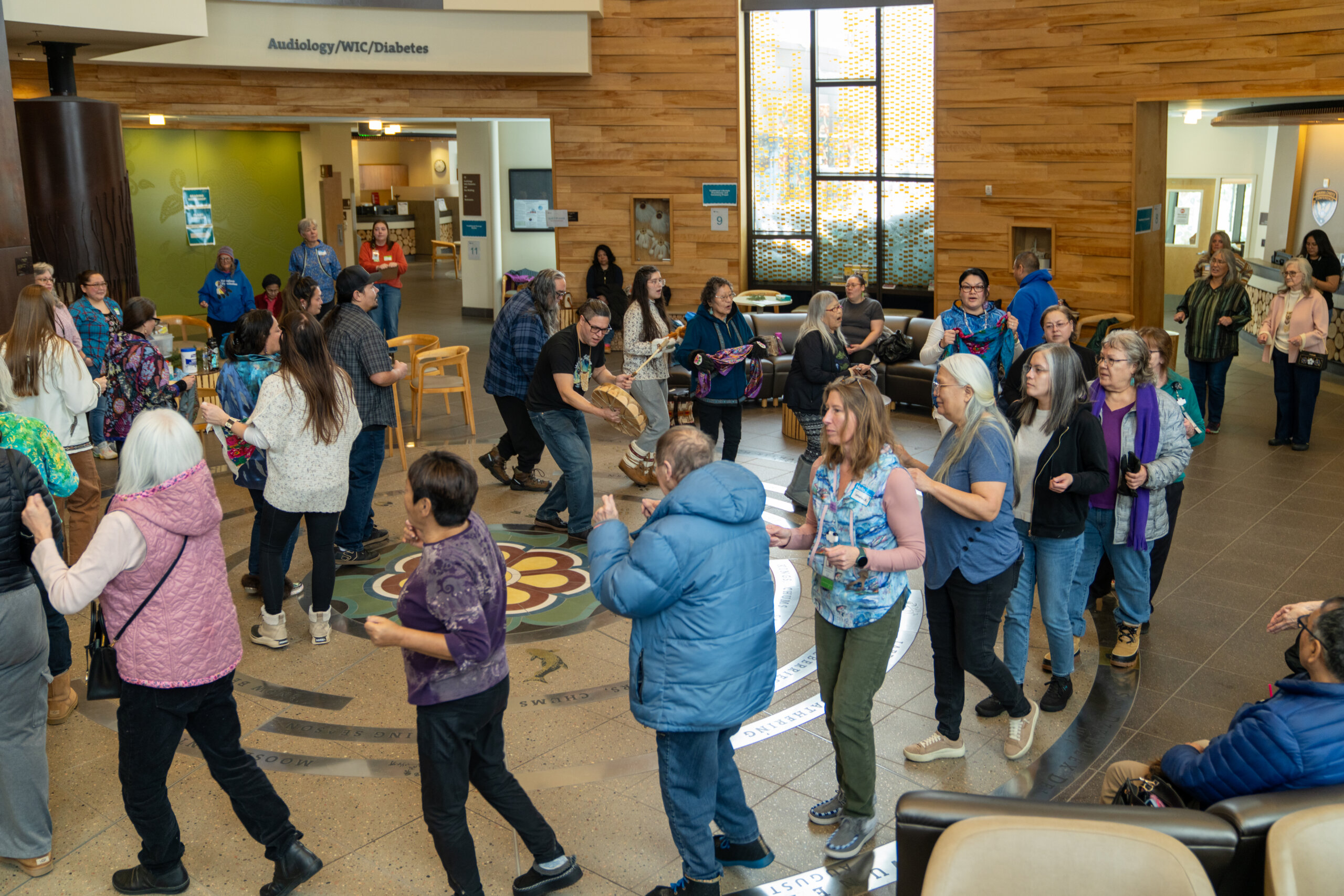 On Saturday, March 7th, the Chief Andrew Isaac Health Center hosted a day with Indigenous Healers. The day began outdoors with a smudging ceremony, where participants were cleansed and then asked to set intentions for the gathering. Next, the Dene’ Eslaanh Dance Group invited everyone to join in singing and dancing—filling the atrium with movement, joy, and shared energy. Elders and youth gave speeches of health and wellness, and traditional healer, Dr. Allison Kelliher, presented medicine bags to Physician Assistants Mara Becker and Marilyn Attla, who are training in Indigenous Healing techniques.