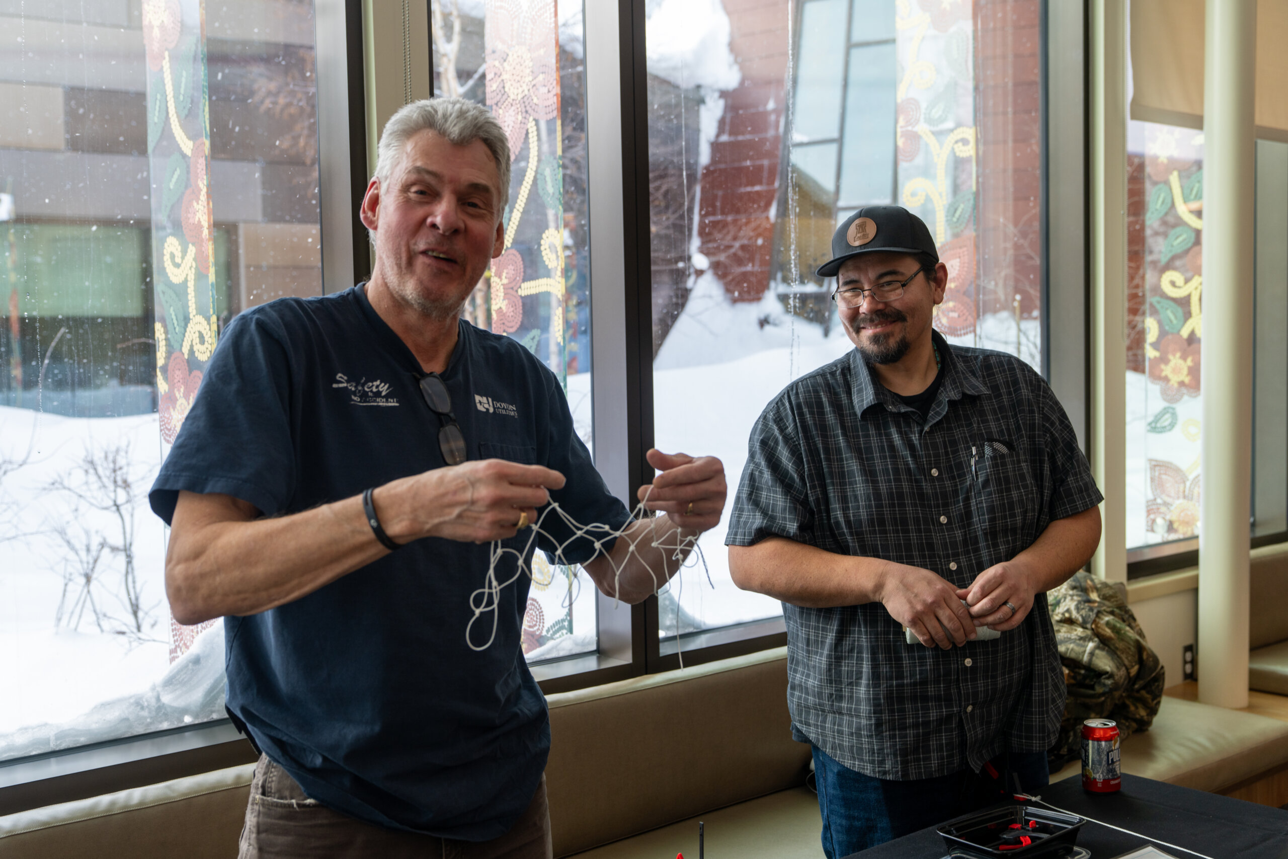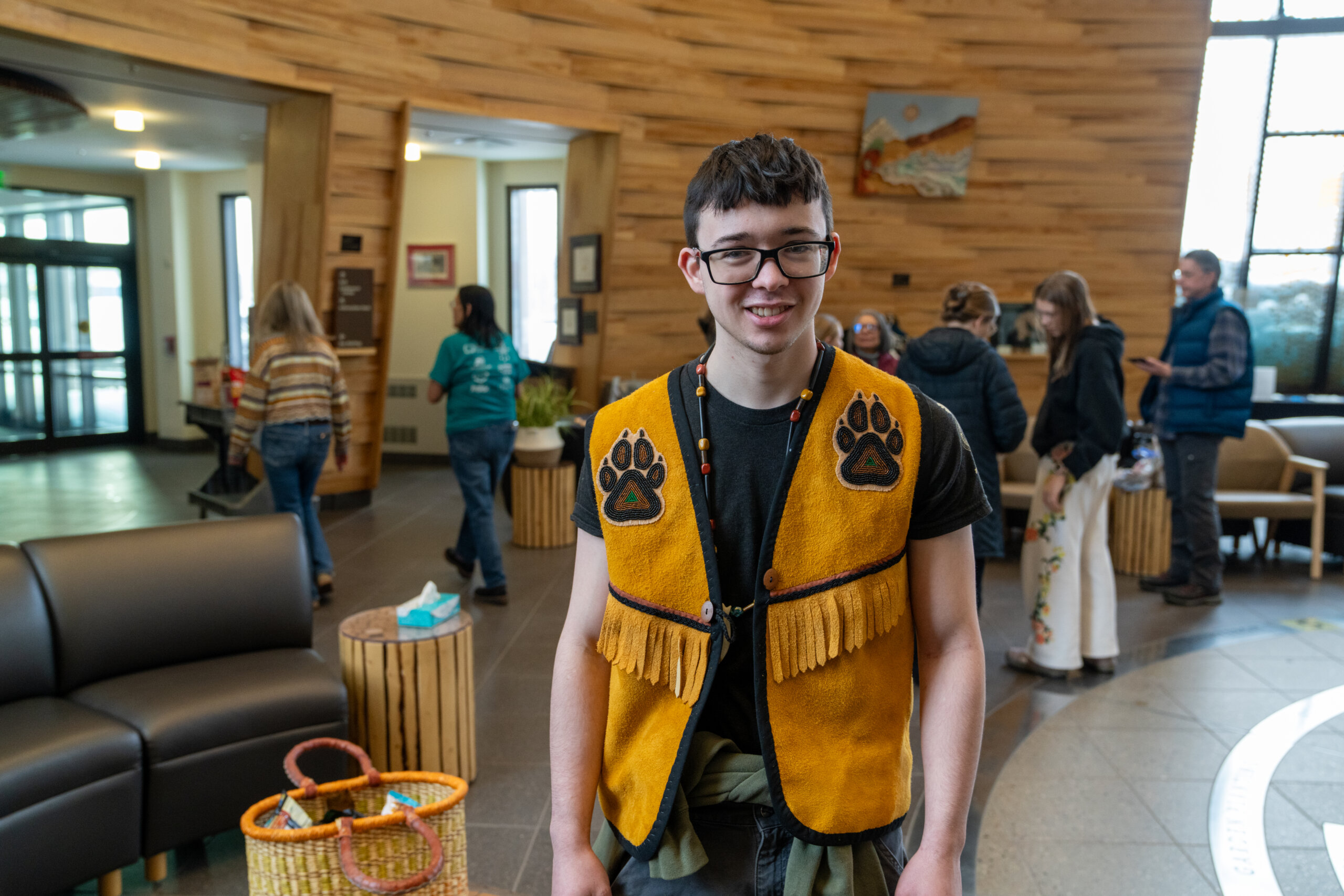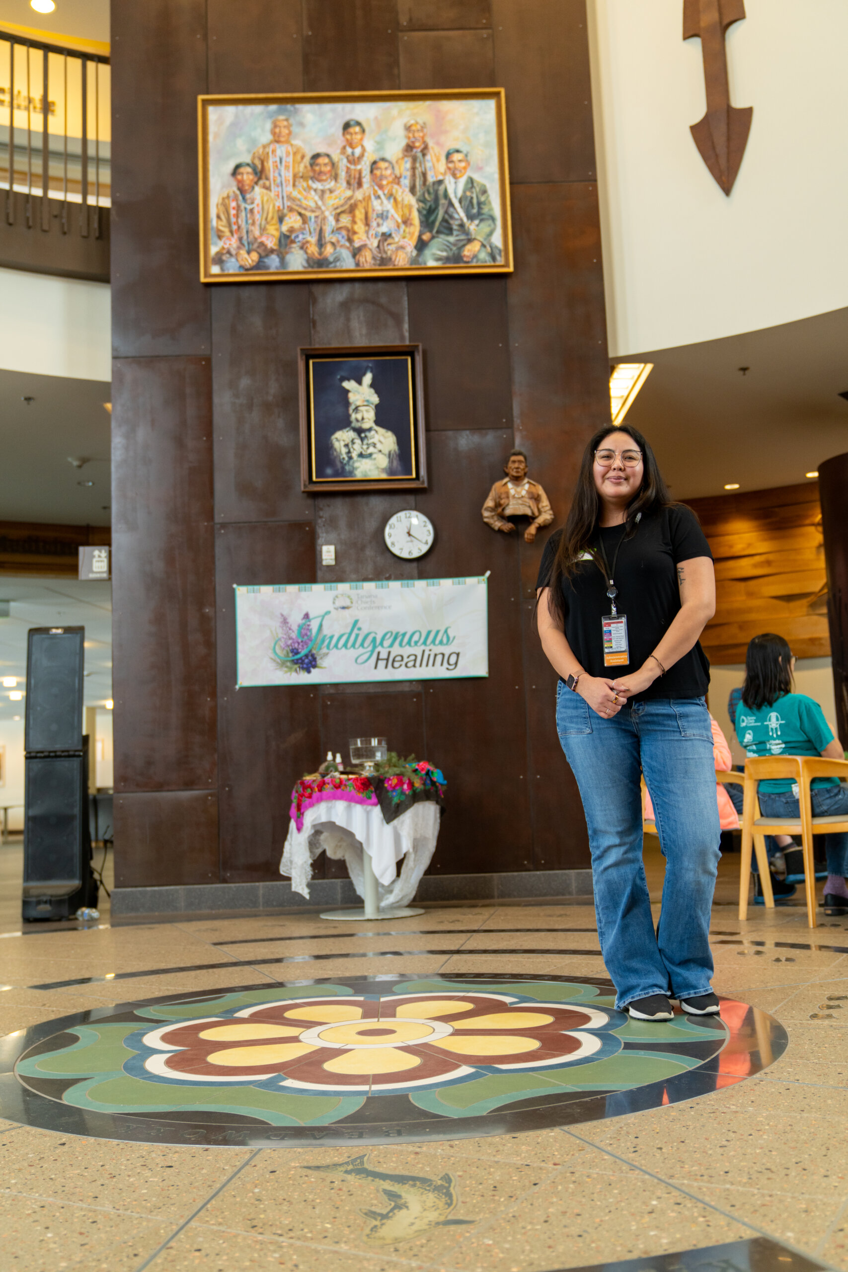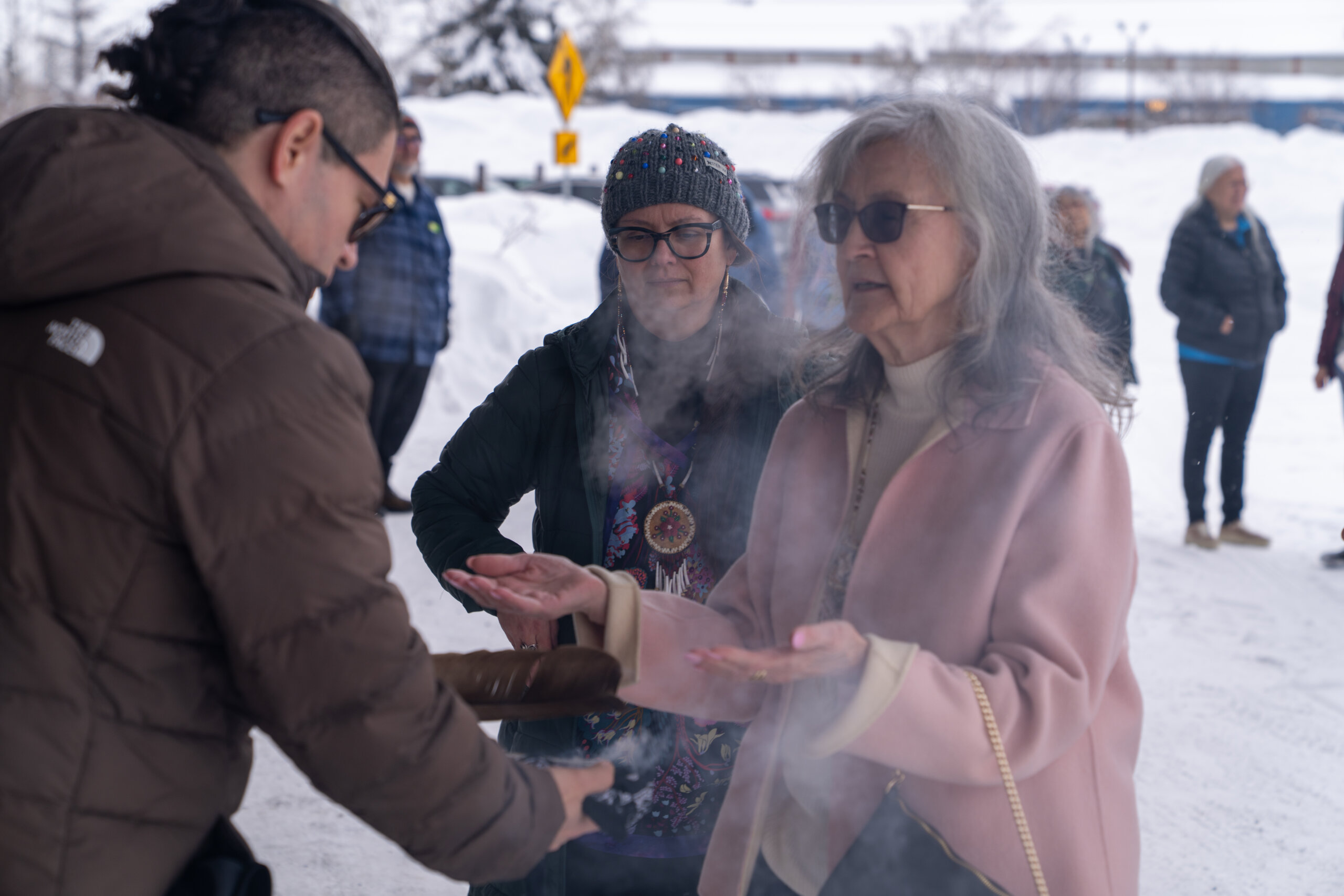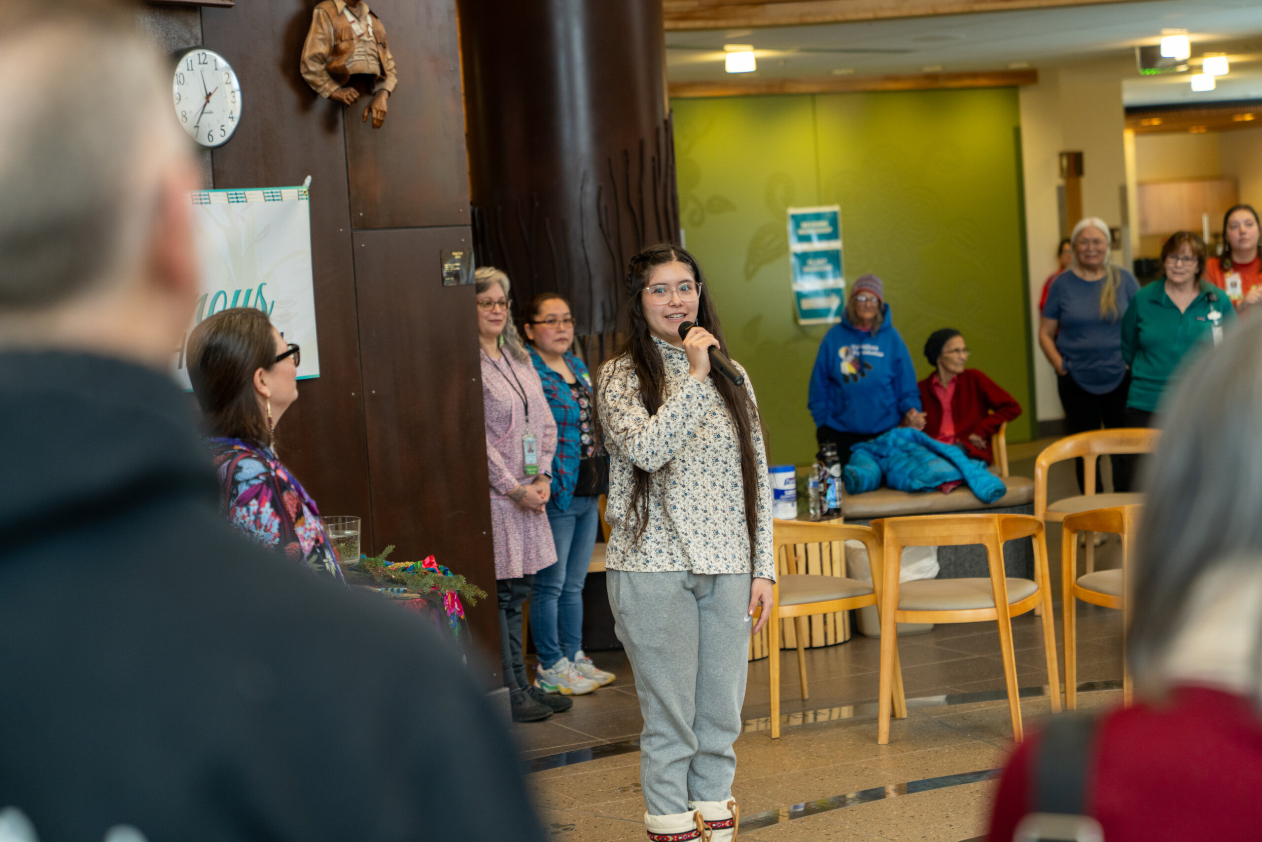 On Saturday, March 7th, the Chief Andrew Isaac Health Center hosted a day with Indigenous Healers. The day began outdoors with a smudging ceremony, where participants were cleansed and then asked to set intentions for the gathering. Next, the Dene’ Eslaanh Dance Group invited everyone to join in singing and dancing—filling the atrium with movement, joy, and shared energy. Elders and youth gave speeches of health and wellness, and traditional healer, Dr. Allison Kelliher, presented medicine bags to Physician Assistants Mara Becker and Marilyn Attla, who are training in Indigenous Healing techniques.