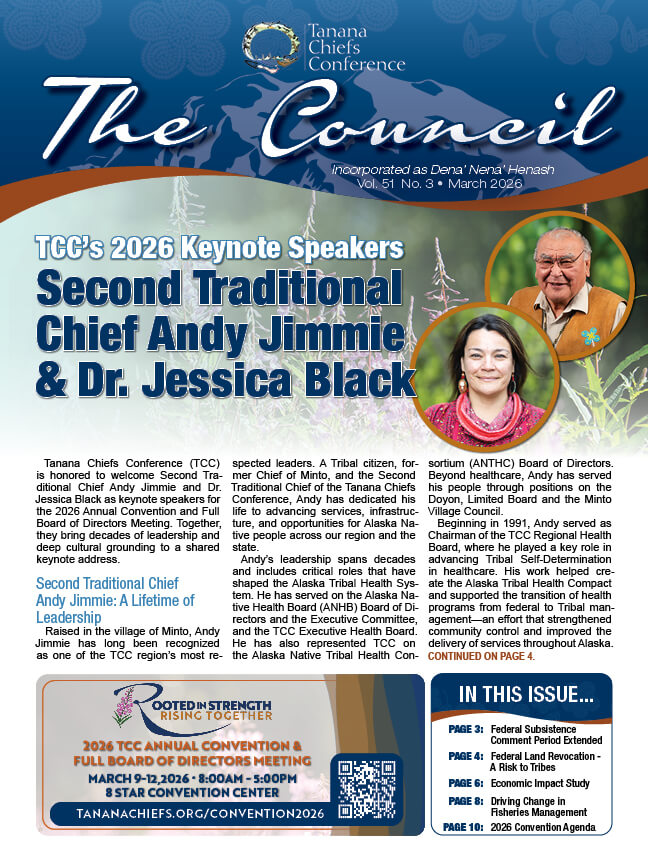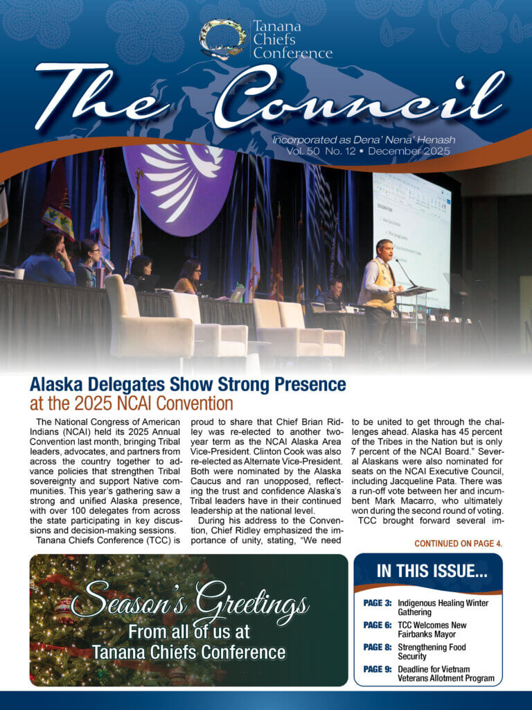 The Council Newsletter is the official newsletter of Tanana Chiefs Conference. It is distributed to over 5,000 individuals including TCC Tribes and Beneficiaries. This publication provides a way for TCC to inform beneficiaries on updates and services.